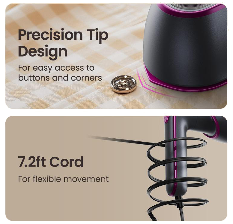 The precision tip gets into tight spaces like collars and button lines, while the 7.2ft cord gives you freedom to move—reaching hanging clothes or working at any angle without fighting a short cable.
